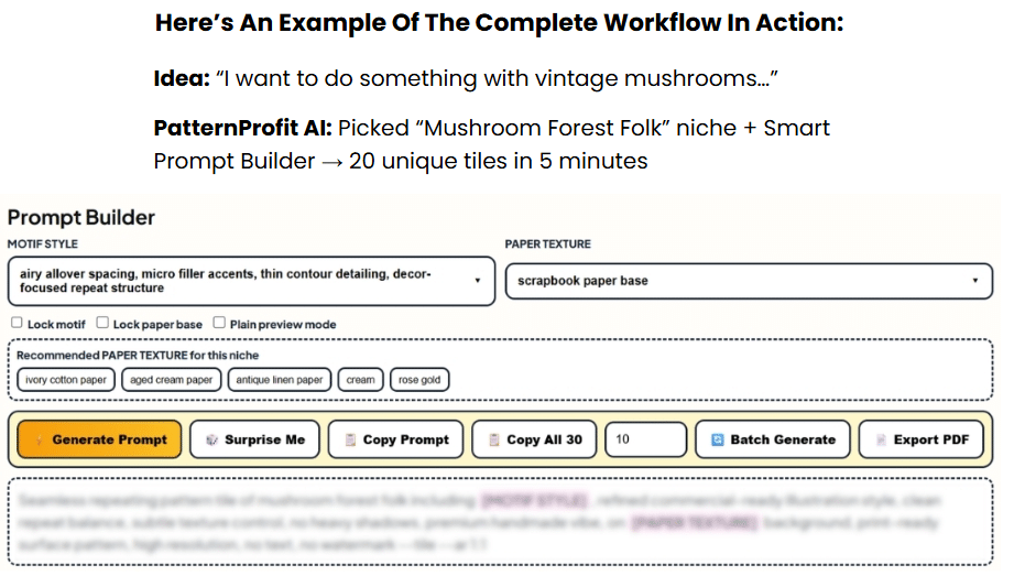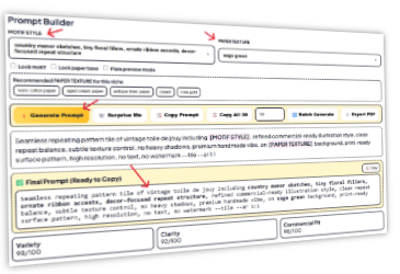 - Smart Prompt Builder: Auto-generated niche-specific AI prompts for seamless patterns.
