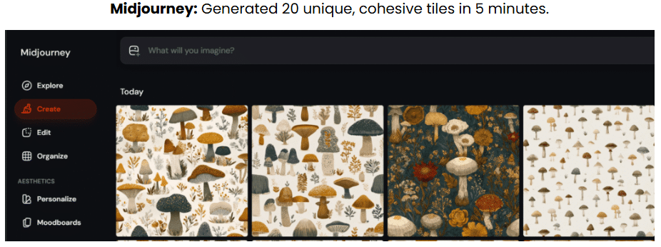Using the Smart Prompt Builder, you pick object mixes and backgrounds to generate flawless AI prompts tailored for seamless design creation. Paste these prompts into Midjourney or another compatible AI tool to produce multiple unique tile variations rapidly.