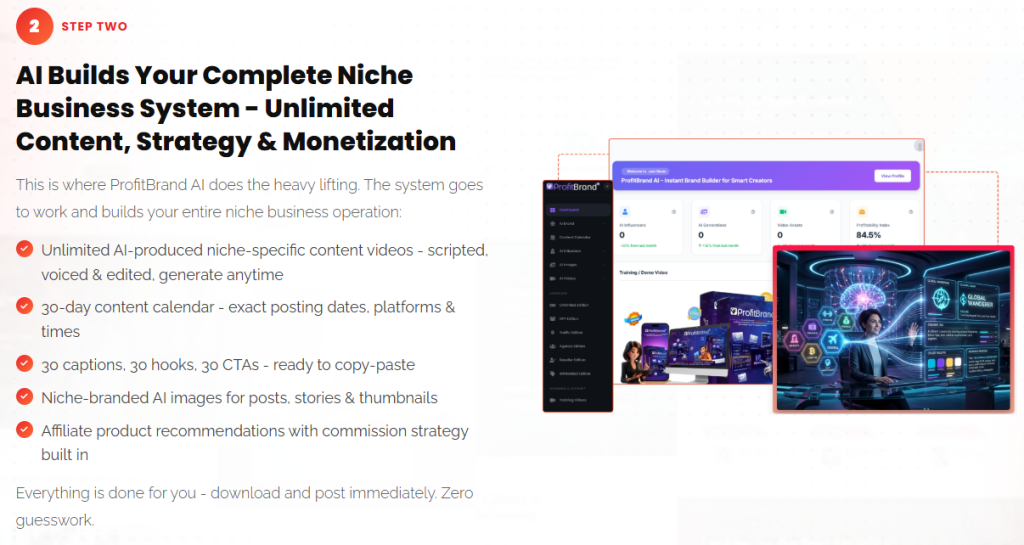 - Step 2: AI/System Execution – The AI produces a full niche business system: unlimited niche-specific video content scripts with voiceovers, a 30-day posting calendar, captions, hooks, calls to action, branded images, and a built-in affiliate monetization strategy.
