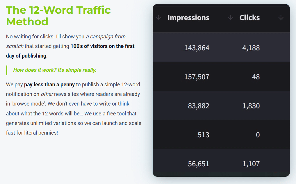 - 12-Word Notification Traffic Method: Enables you to place short notifications on external news sites for less than a penny each visitor, accessing audiences already in browse mode and ready to engage. This drastically reduces traffic costs while increasing quality clicks.