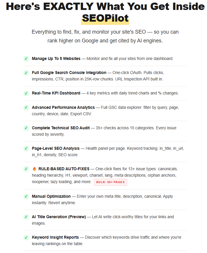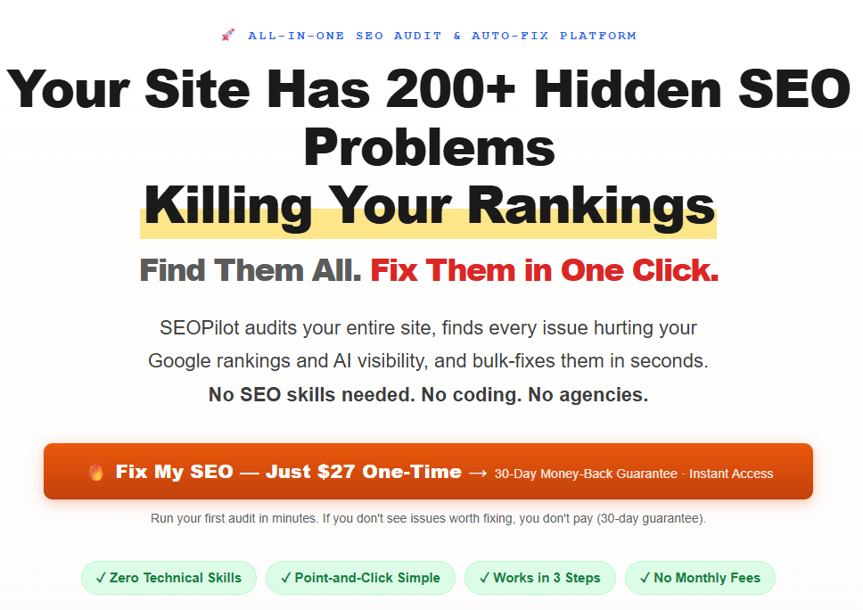 SEO Pilot offers an incredibly simple, affordable, and powerful solution to the often overlooked world of technical and on-page SEO. Its unique ability to detect and fix hundreds of hidden SEO issues with one click and without technical know-how makes it a must-have for anyone who wants to boost organic rankings and visibility in AI-powered search results. With a risk-free 30-day guarantee and lifetime access at an unbeatable price, it is one of the smartest SEO investments you can make in 2026.