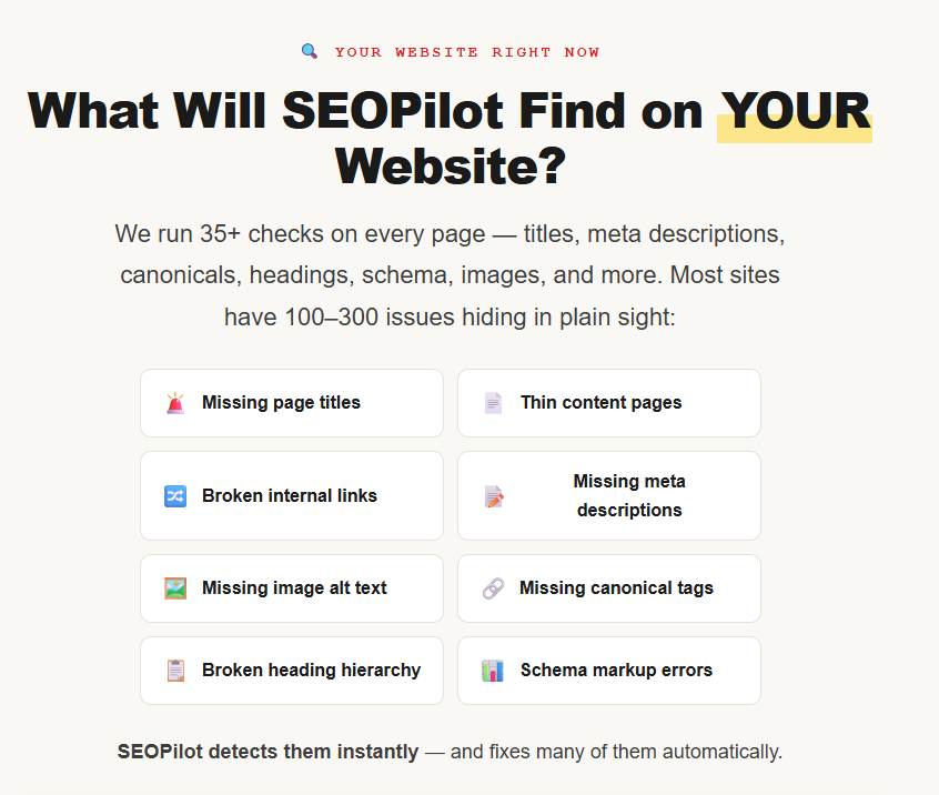 What makes SEO Pilot stand out is its ability to automatically fix over a dozen issue types across hundreds of pages with a single click. By replacing the old tedious workflows—which required manual edits, crawling multiple tools, or hiring expensive agencies—SEO Pilot streamlines the process into a simple, no-code, point-and-click solution.
