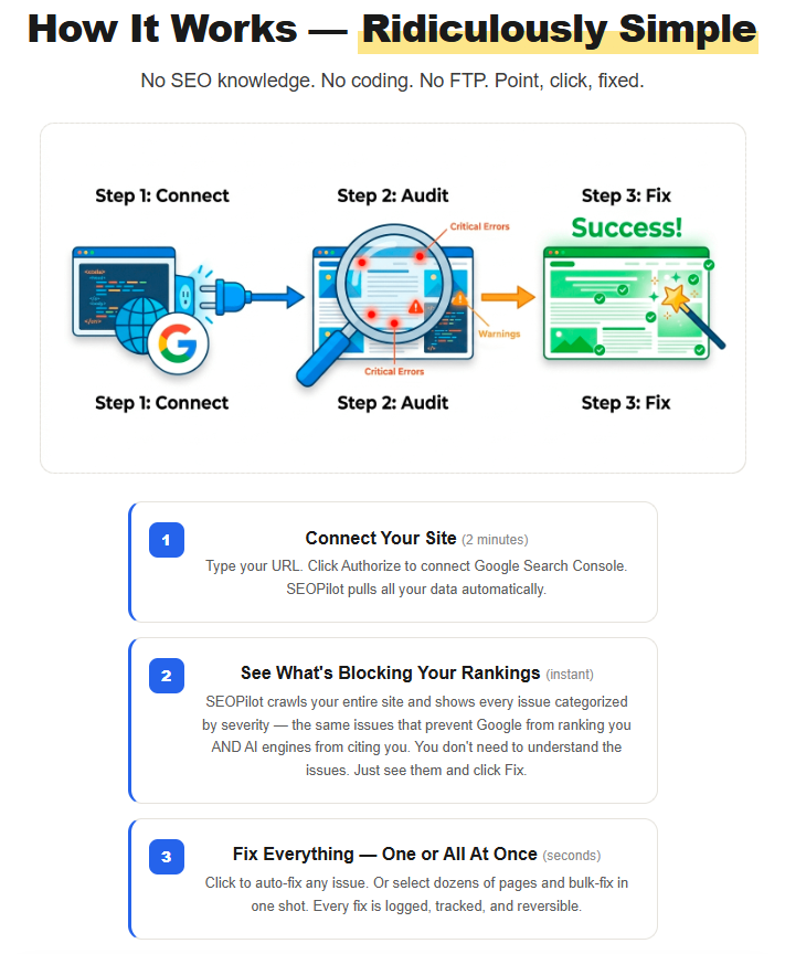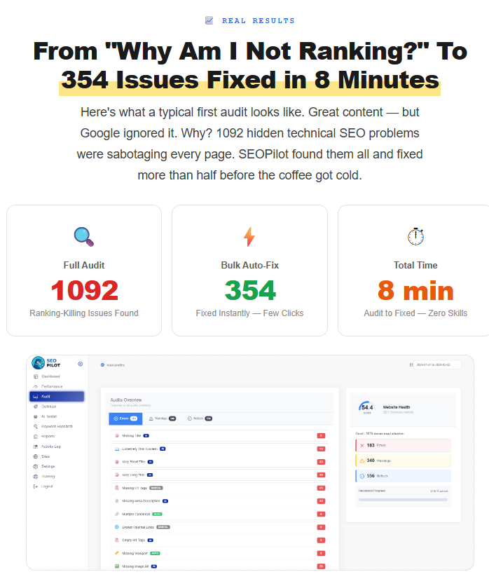 Enter SEO Pilot, an all-in-one platform designed to audit your entire site and auto-fix these issues instantly with just one click. No coding, no SEO degrees, and no agency fees. This could be the game-changer your website’s been waiting for.