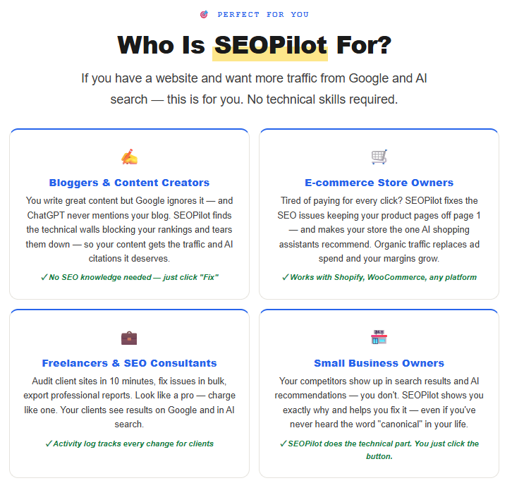 SEO Pilot is perfect for anyone who wants to improve their website rankings without mastering SEO or spending a fortune on agencies. Bloggers, e-commerce store owners, affiliate marketers, and SEO professionals looking to streamline audits and bulk fixes will benefit greatly. Beginners and small business owners who want hands-off technical SEO improvements will also find it invaluable.