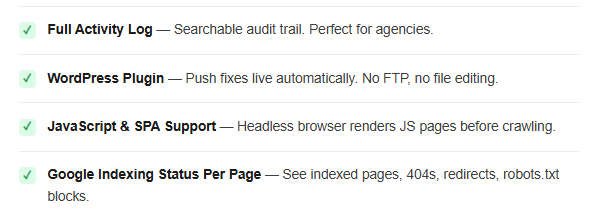 Yes, it supports WordPress, Shopify, Wix, React SPAs, and other custom sites. - Q: Does it fix both audits and SEO problems?