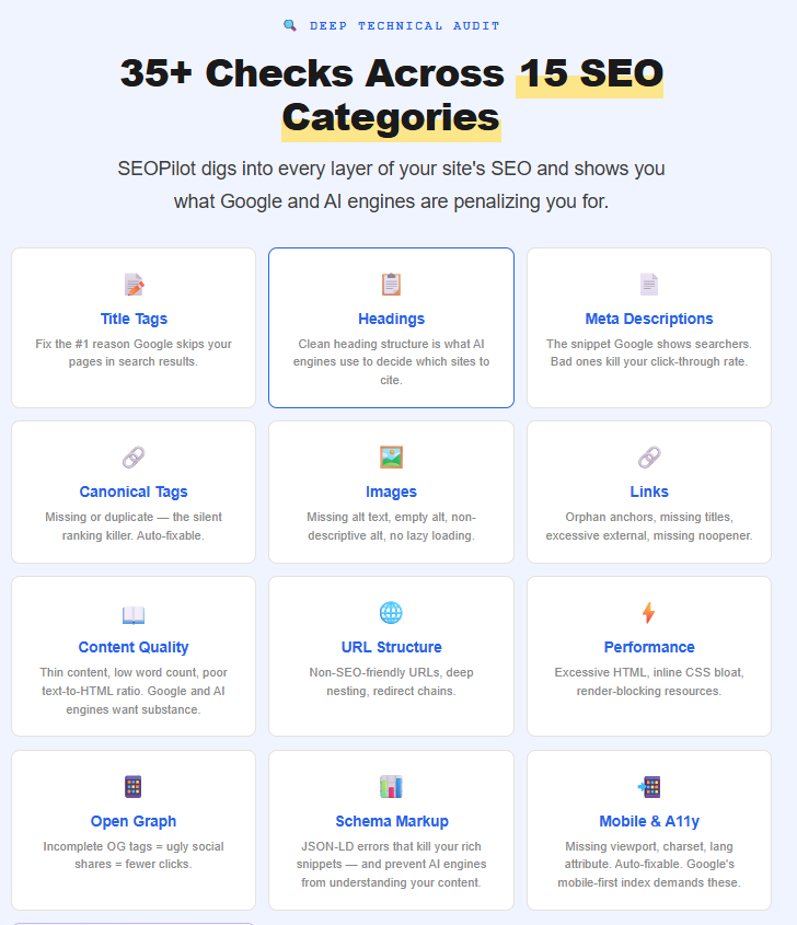 - Comprehensive, multi-category SEO audit covering 35+ checks