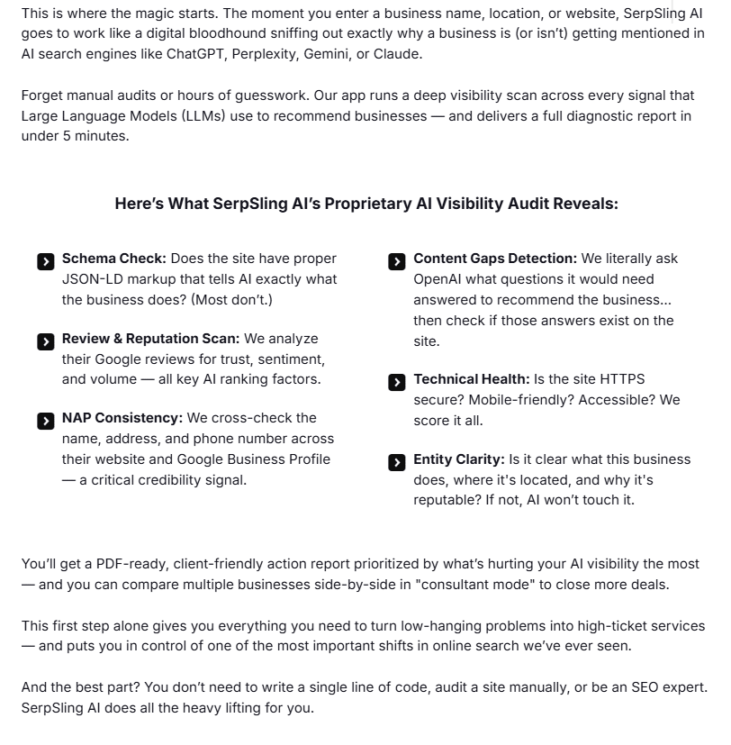 - Business Owners: Get your local or online business found in AI searches without paying for ads or hiring developers.