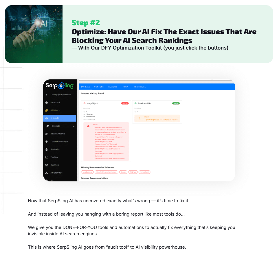 - Automated Optimization: Generates AI-optimized content and injects precise schema markup.