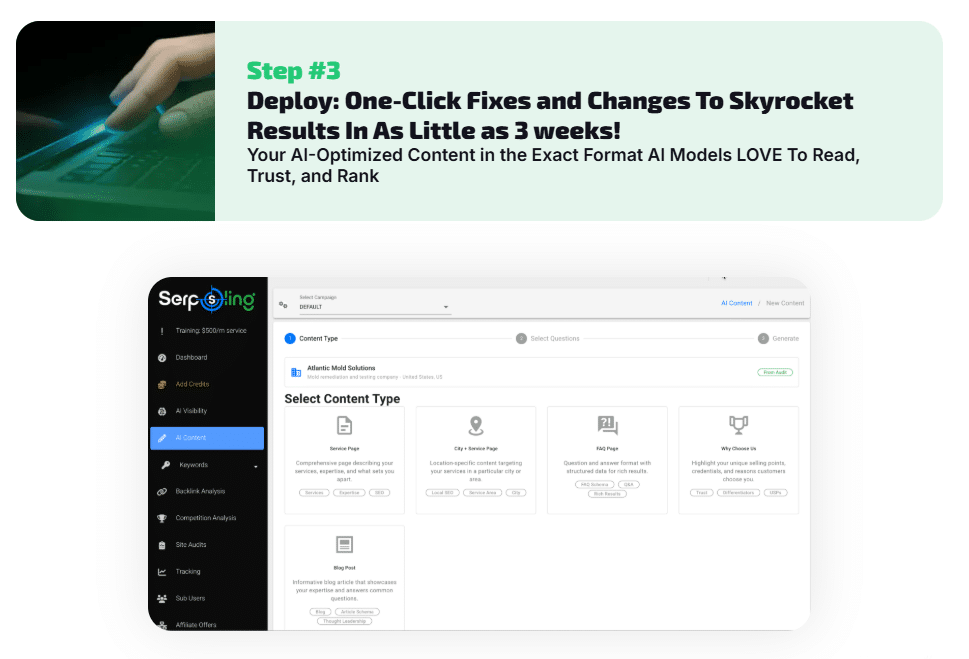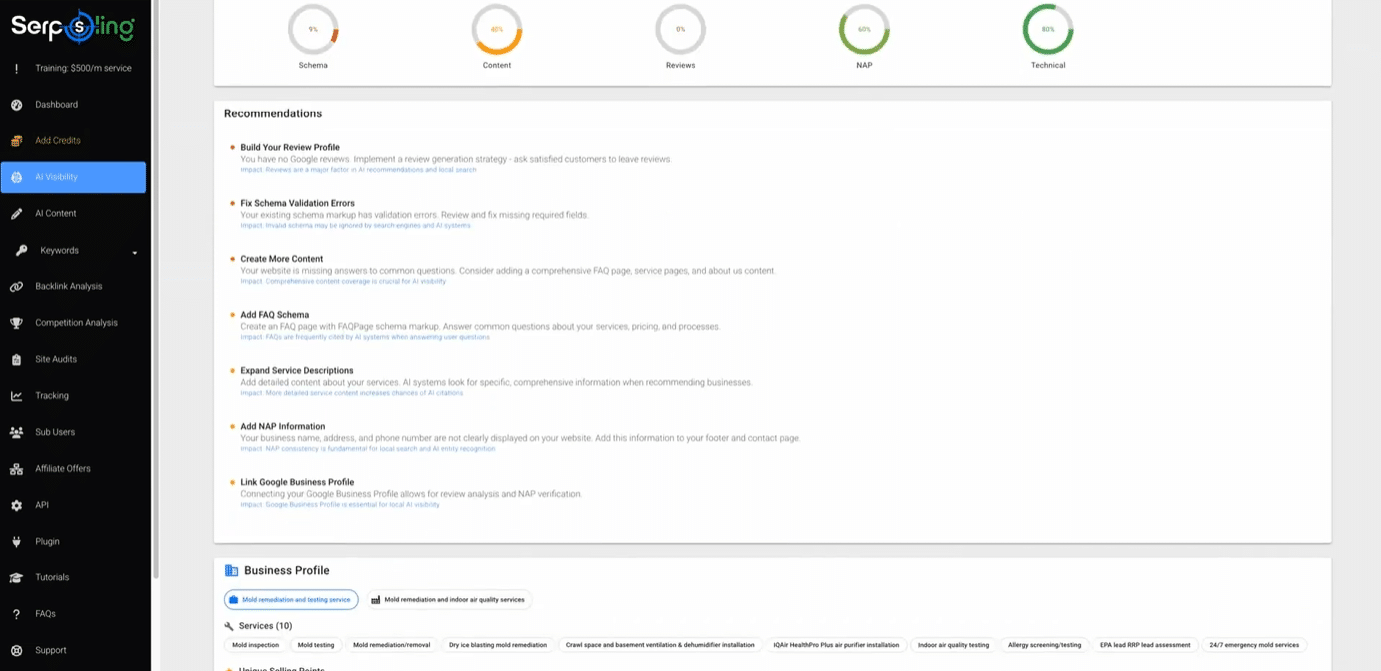 Using its proprietary AI, the platform auto-generates LLM-optimized content, applies relevant schema markups, fixes NAP consistency issues, and prepares your site for AI indexing.