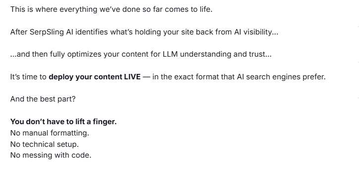 Simple Explanation: SerpSling AI is a fully automated platform that audits, fixes, and deploys AI-friendly SEO changes to your websites, so your content appears in AI search engines, instantly attracting buyer-ready traffic.