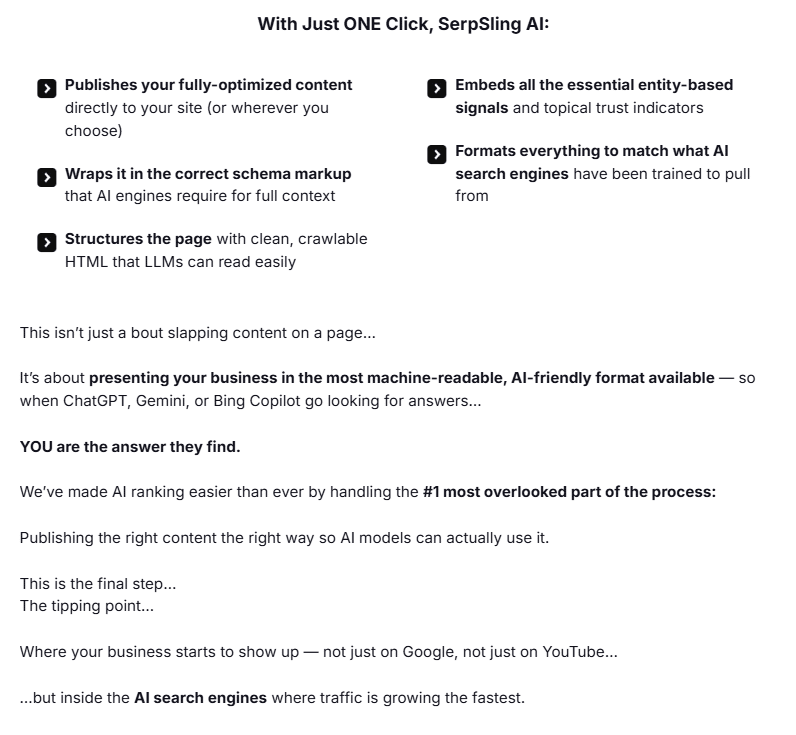 - Short conclusion: SerpSling AI is a game-changer that turns complex AI SEO into a simple 3-step process, making it easier than ever to capture high-converting, free traffic in the rapidly growing AI search space.