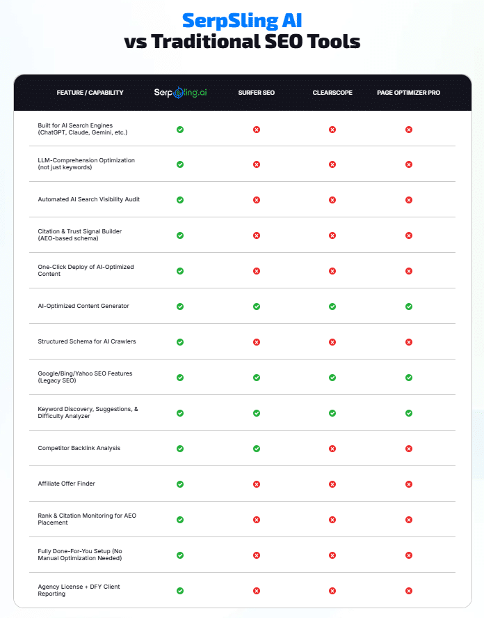 Compared to traditional SEO tools like Surfer SEO, Clearscope, or Page Optimizer Pro, SerpSling AI focuses exclusively on AI-powered search engines, which operate on fundamentally different algorithms and rankings.