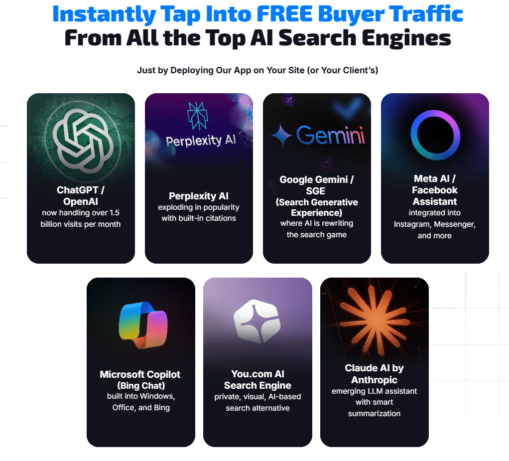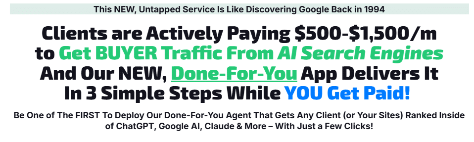 - Biggest strength: It offers a done-for-you AI audit, content generation, schema injection, and one-click deployment system that delivers buyer-intent traffic from emerging AI search engines, all without coding or SEO expertise.