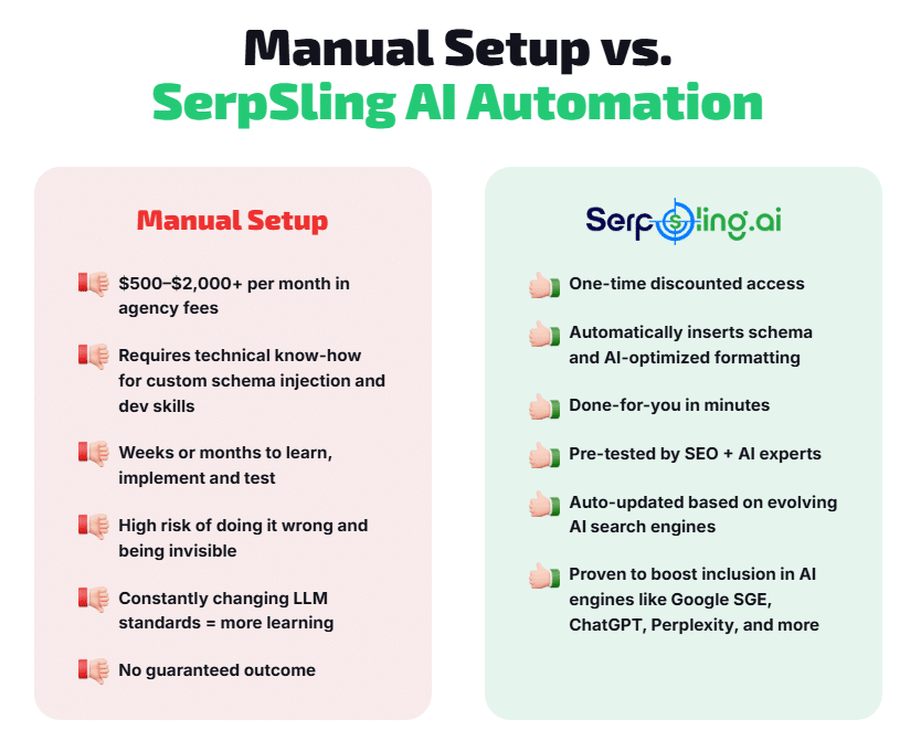How It Replaces the Old Workflow: Manual AI SEO requires tedious audits, coding expertise to insert complex schema, extensive content reformatting, and ongoing maintenance. SerpSling AI consolidates all these steps into a few clicks, eliminating guesswork and costly outsourcing.