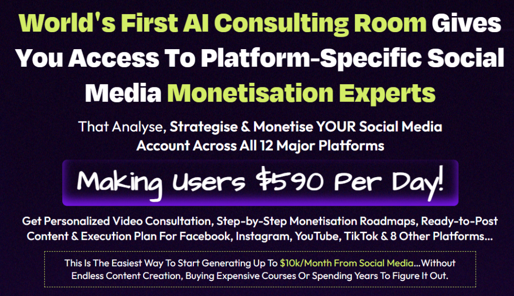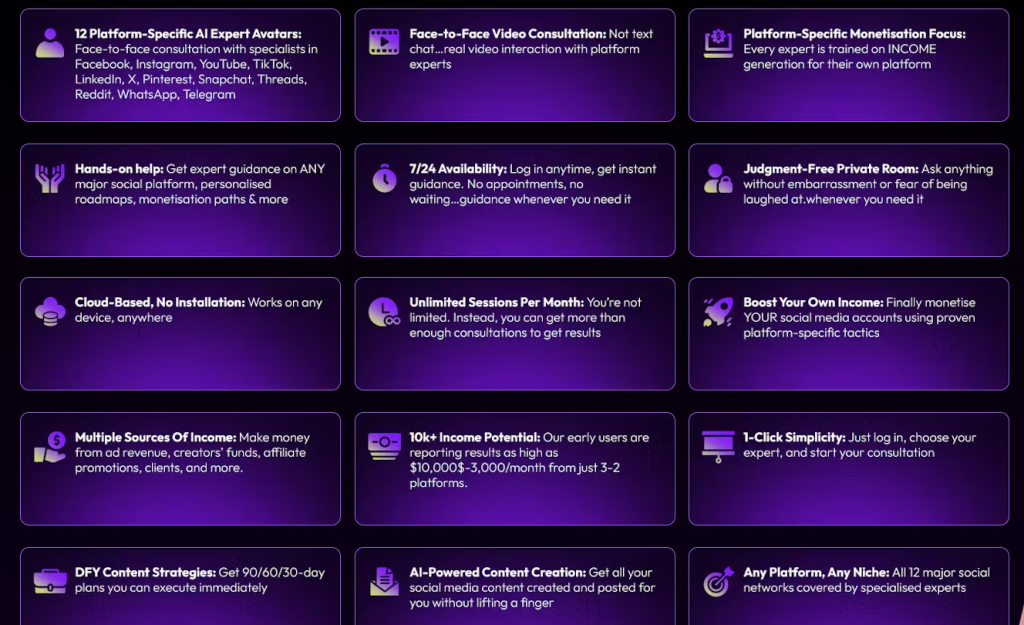 SociExperts AI positions itself as your 24/7 social media monetisation command center. Instead of generic advice, it connects you face‑to‑face with platform‑specific monetisation specialists for Facebook, Instagram, YouTube, TikTok and nine other major networks. You get live video consultations, a bespoke monetisation roadmap, ready‑to‑post content packs, and revenue‑focused strategies covering ads, sponsorships, affiliate marketing, subscriptions, shopping and more.