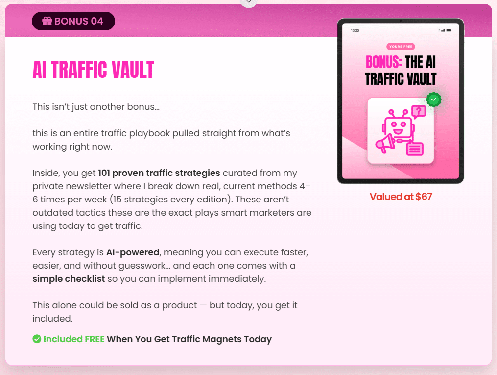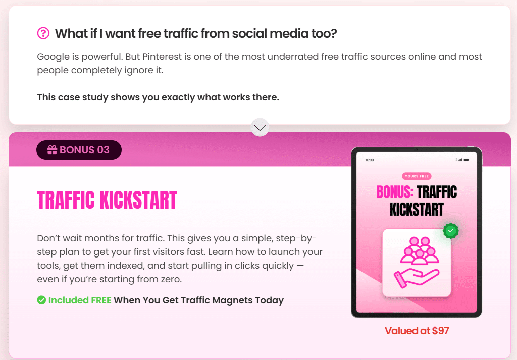 For anyone serious about creating multiple passive traffic streams with minimal technical hassles, this product deserves strong consideration. It’s ideally suited for those wanting to escape the endless content hamster wheel or high ad spend. Simply put, Traffic Magnets feels like a legit game-changer for organic traffic.