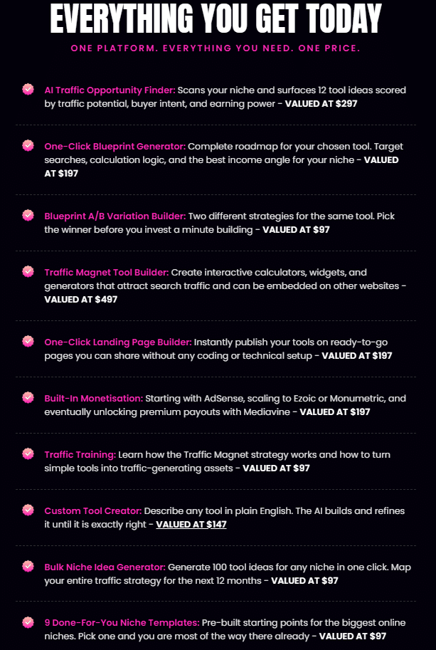 Traffic Magnets is an all-in-one software platform designed to create interactive online tools—such as calculators, quizzes, or generators—that naturally rank on Google and pull steady free traffic without paid ads.