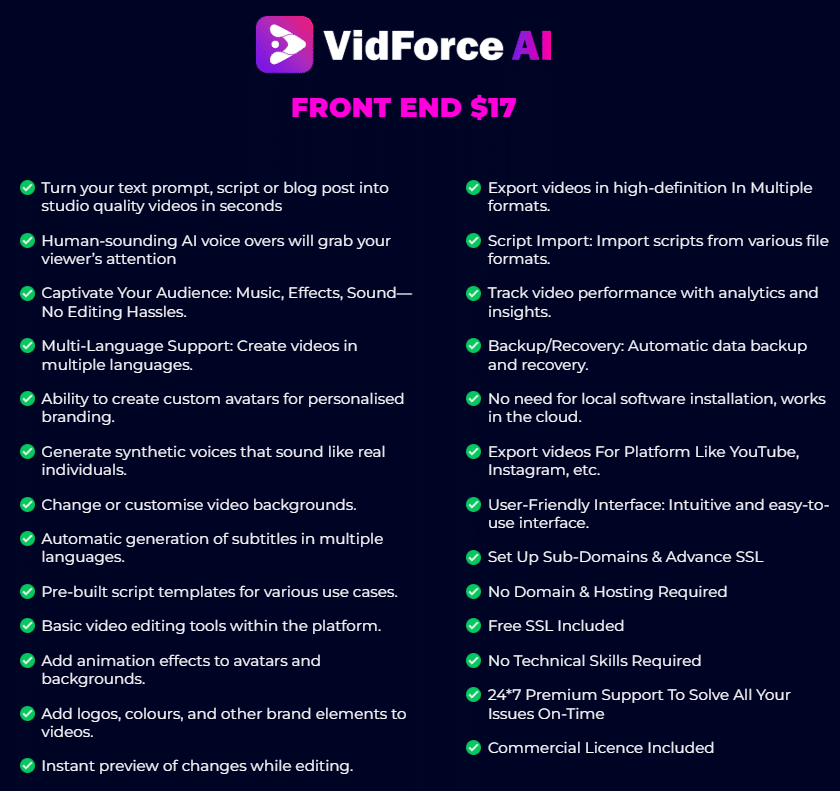 Currently, VidForce AI offers a strong introductory price of a one-time payment of $17 (limited-time offer), which includes lifetime access with a full commercial license. Compared to the monthly costs of traditional software — often ranging from $20 to $300 per month — this is a fantastic deal.