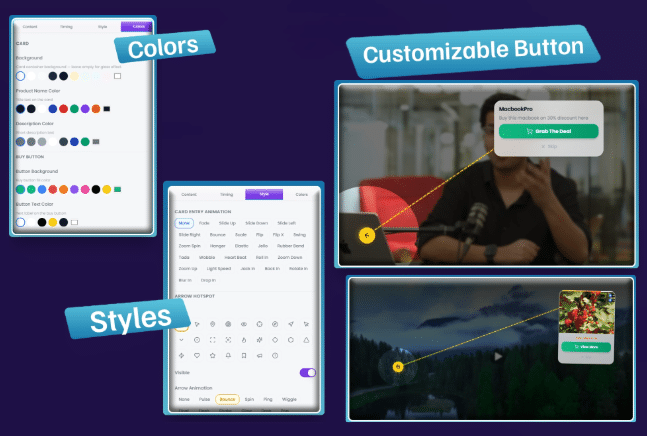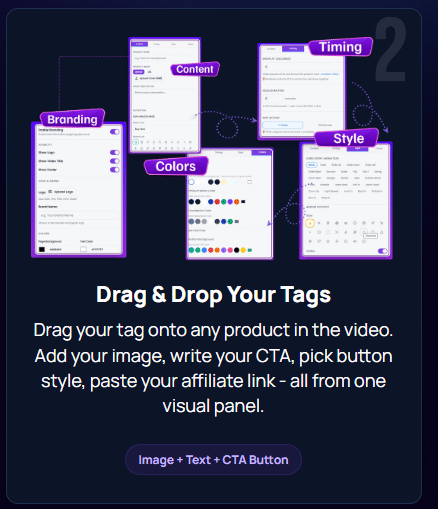 Use the drag-and-drop tag builder to place product images, add descriptive text, and customize CTA buttons at specific timestamps and locations on the video. Link each tag to your chosen affiliate URL.