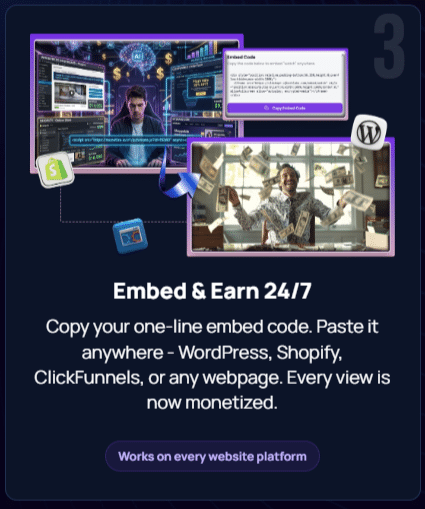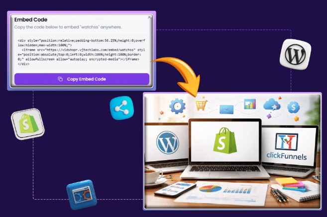 Generate a 1-click embed code that works on any website – WordPress, Shopify, Wix, Clickfunnels, and more. The embedded video becomes shoppable, turning views into clicks and commissions 24/7.