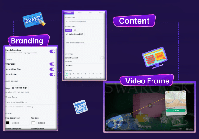 Visually place product tags anywhere on the video frame without any coding. This flexibility ensures you match the exact product shown at the right moment.