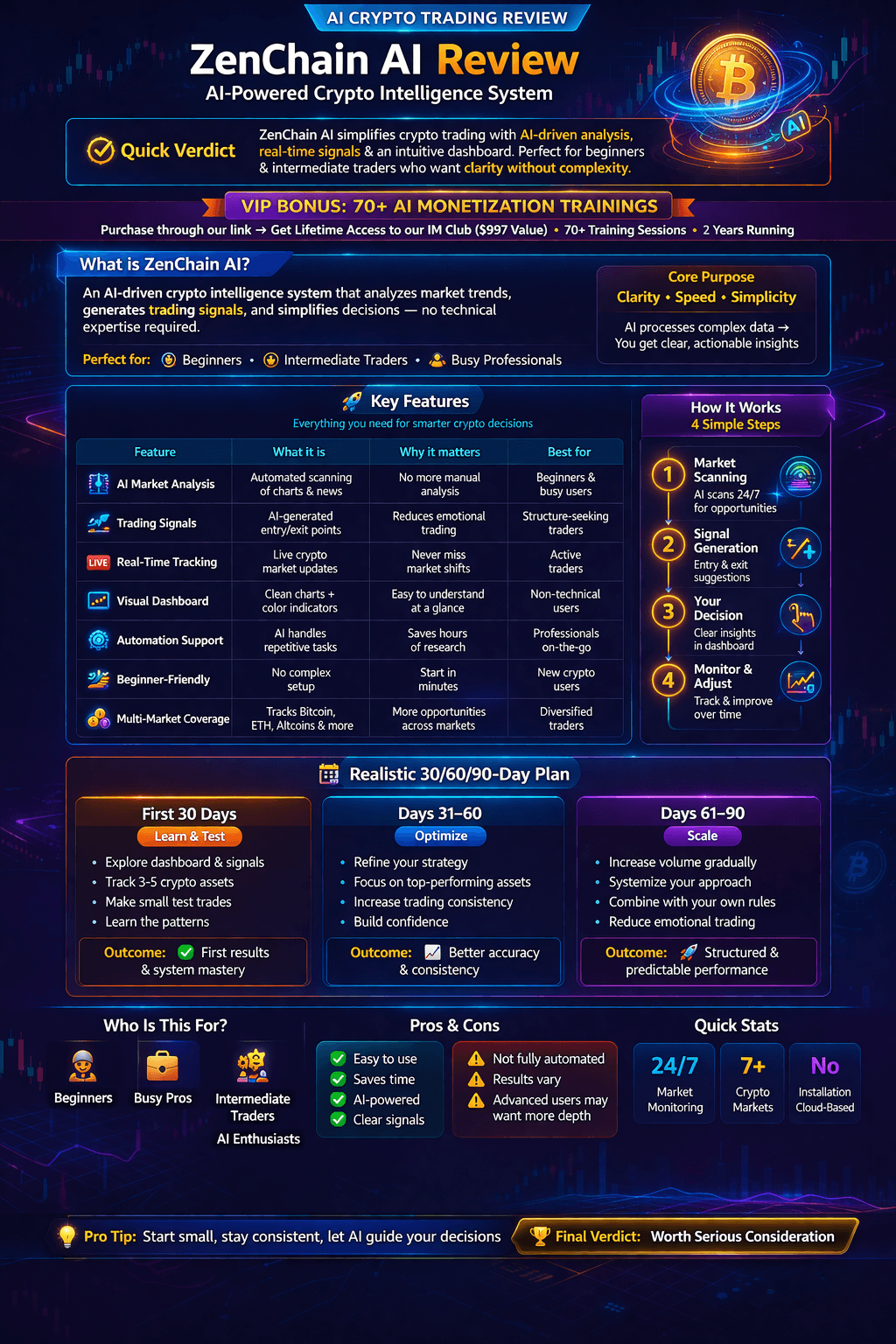 ZenChain AI is a structured, AI-powered crypto analysis and automation platform designed to simplify trading decisions and market research. It combines data-driven insights, predictive signals, and user-friendly dashboards to help users navigate the fast-moving crypto market with more clarity and confidence. If you’re looking for a system that reduces guesswork and presents actionable insights in a simplified format, ZenChain AI offers a practical, beginner-friendly approach while still providing enough depth for more experienced users.